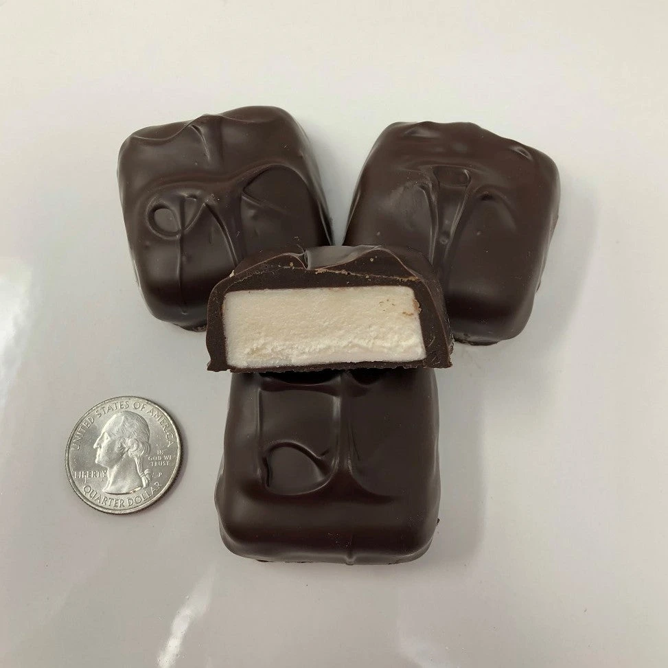 Dark Chocolate Jumbo Vanilla Marshmallow. A white fluffy marshmallow square, approx. 1-3/4 inches, covered in delicious dark chocolate!! This listing is for a 1 pound box of gourmet dark chocolate jumbo vanilla marshmallows.