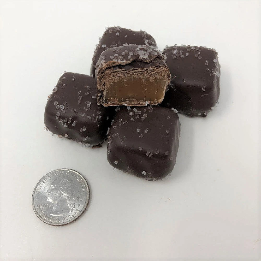 Sugar Free Dark Chocolate Vanilla Caramels with Sea Salt sprinkled on top. A Smooth, Delicious Sugar Free Dark Chocolate Sea Salt Vanilla Caramel!! This listing is for a 1 pound box of gourmet sugar free dark chocolate sea salt vanilla caramels.
