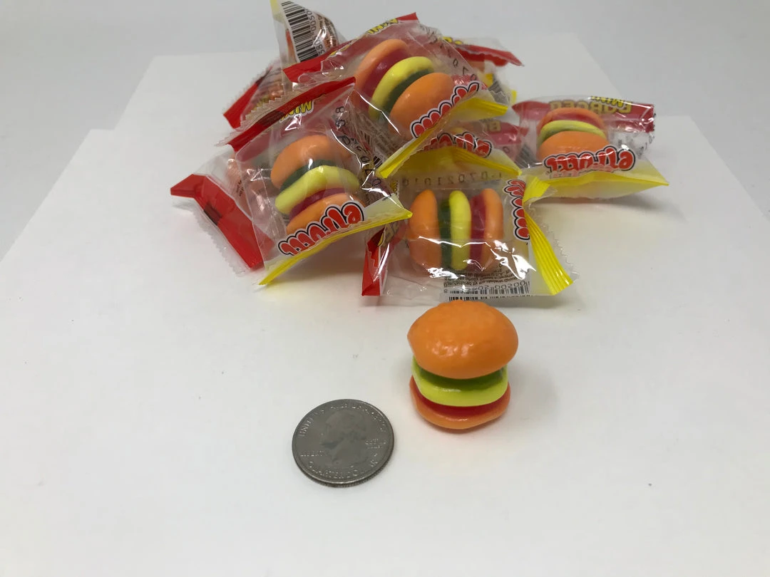 Gummi Mini Hamburgers. Individually wrapped Mini Hamburger-shape Gummy candy. These Gummy Hamburgers have a general fruit flavor. A unique novelty candy. This listing is for a bulk 2 pound bag of Mini Gummi Hamburgers. Over 80 pieces in this 2 pound bag.
