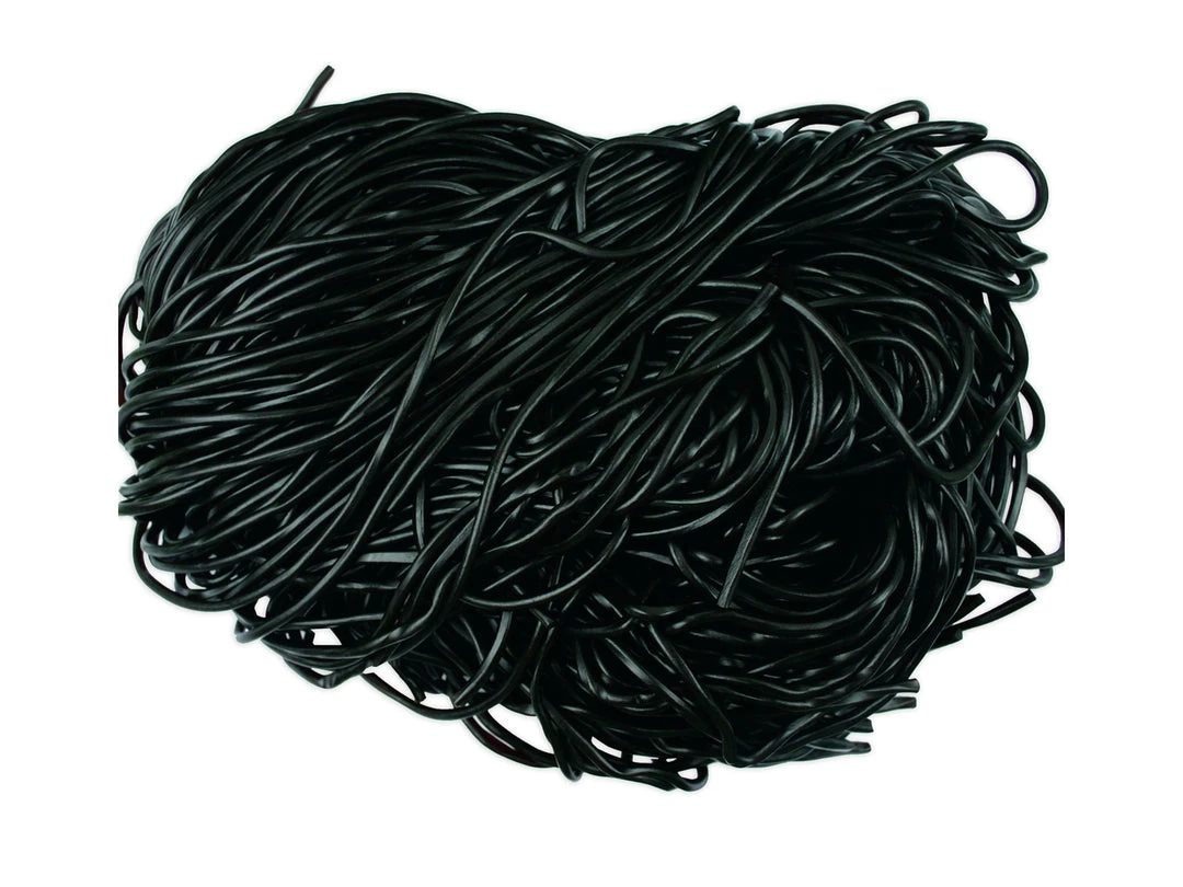 Black Licorice Laces. Imported from the Netherlands, this licorice shoestring is sure to keep you busy for hours!! This listing is for a bulk 2 pound bag of Black Licorice Laces.