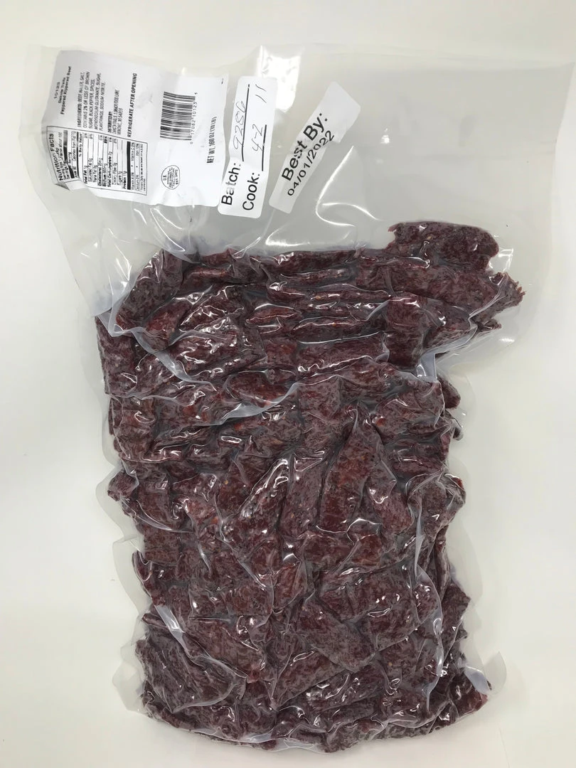 Peppered Flavor Moist Kippered Beef Jerky. Fresh, Moist, and Tender Beef Jerky Pieces typically 1 to 4 inches long. This listing is for a bulk 10 pound vacuum sealed bag of Peppered Flavor Kippered Beef Jerky. Best By Date is April 2023. Very Important…After opening the 10 pound bag, we strongly recommend you separate the Jerky into portions and vacuum seal each portion. If you do not have a vacuum sealer, you can also freeze the portions.