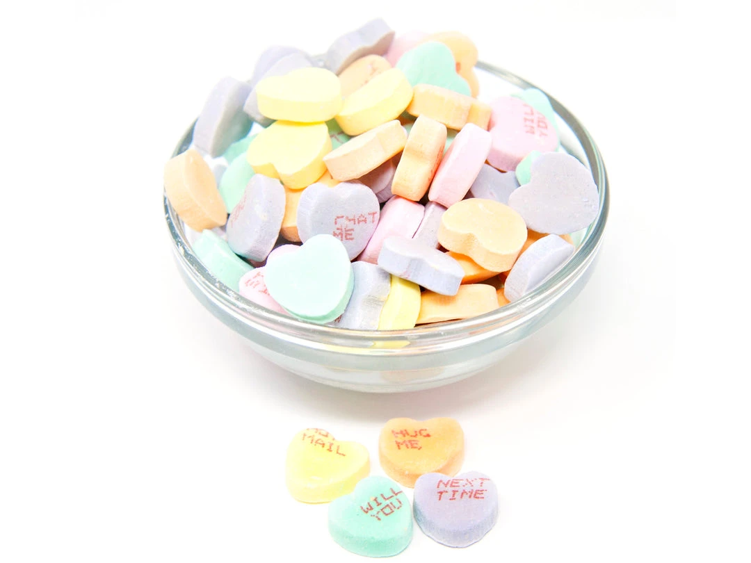 Sweet and Sour Small Conversation Hearts. Traditional Conversation Hearts with a sweet and sour taste and a soft and chewy texture. Flavors include White (fruit punch), Yellow (lemon-lime), Orange (orange), Green (apple), Pink (cherry), and Purple (grape). This listing is for a bulk 1 pound bag of Sweet and Sour Small Conversation Hearts.