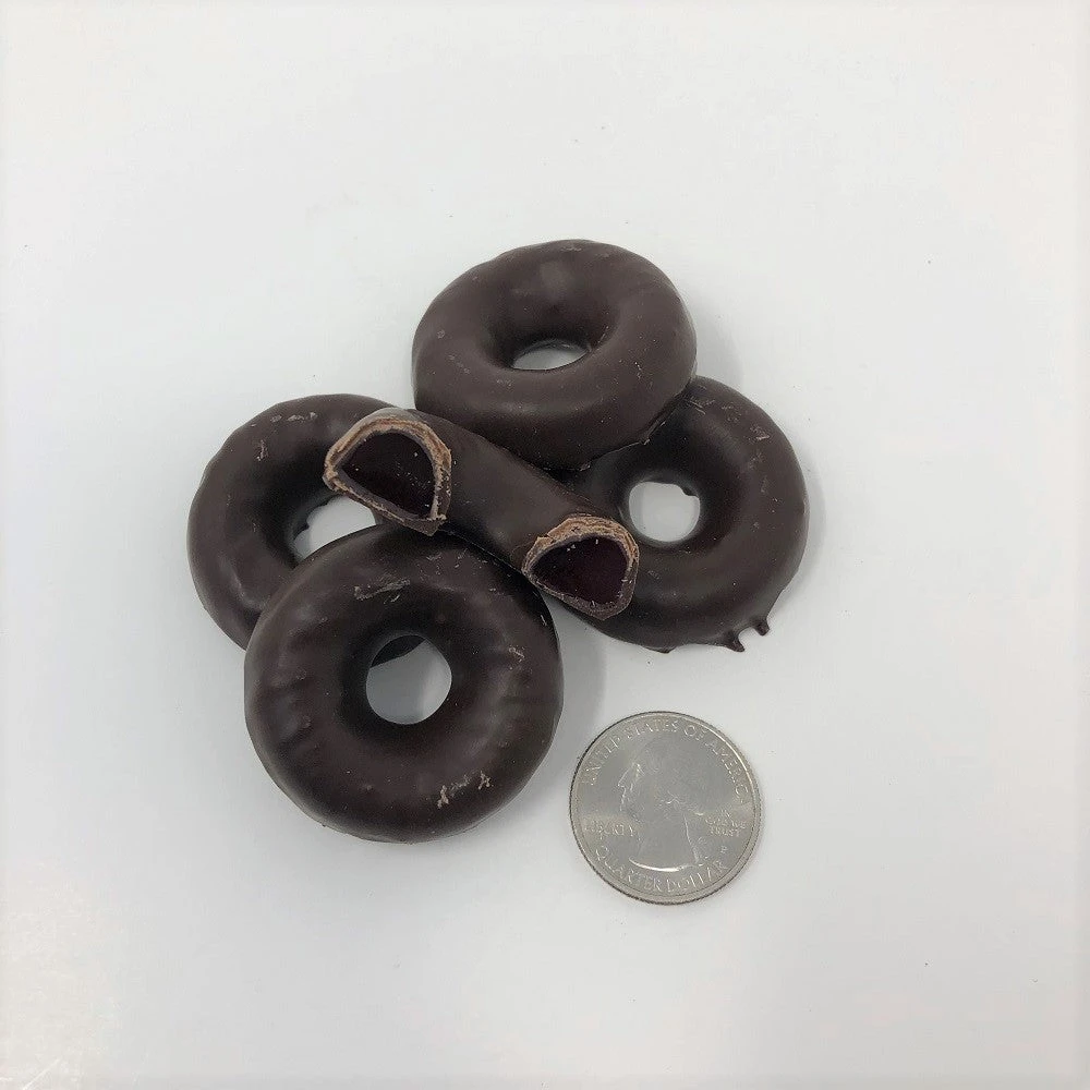 Chocolate covered Raspberry Jelly Rings. A delicious ring of raspberry jelly covered in chocolate!! This listing is for a 1 pound box of Chocolate Covered Raspberry Rings.