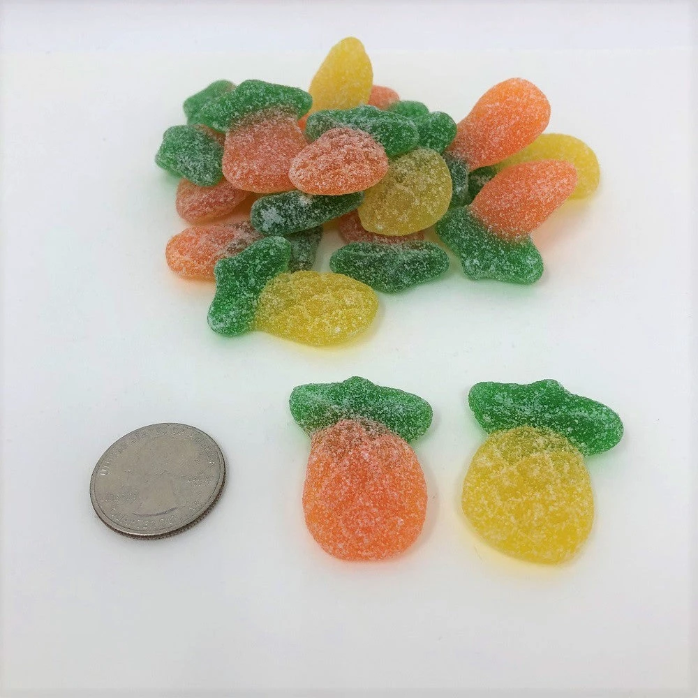 Gummi Sour Pineapples. Fresh, soft, and delicious sour pineapple-flavored gummi candy in orange and yellow with green top stems. This listing is for a bulk 2.2 pound package of Vidal Gummi Sour Pineapples.