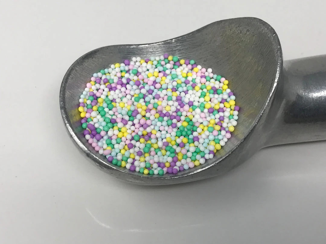 Spring Mix Pastel Nonpareils consisting of pastel lavender, pink, yellow, green and white colors. The perfect topping for your cookies, cupcakes, ice cream, or any other dessert! This listing is for a bulk 8 ounce package of Spring mix pastel nonpareils.